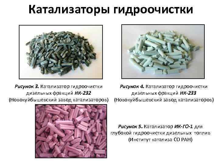 Катализаторы гидроочистки Катализаторы - необходимые для реализации процесса гидроочистки химические вещества, ускоряющие химическую реакцию, но не входящее в состав продуктов реакции. Внешне представляют собой твердые гранулы, могут быть разными по окраске. В состав катализаторов гидроочистки входят компоненты: • платина , палладий , кобальт , никель , молибде вольфрам (не в металлической форме, а форме оксидов и сульфидов); • термостойкий носитель с развитой удельной поверхностью и высокой механической прочностью (оксид алюминия, алюмосиликат, цеолит).