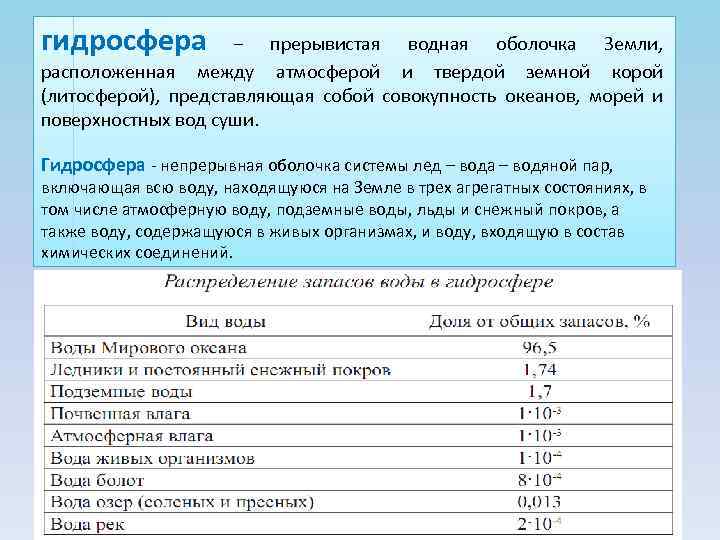 гидросфера прерывистая водная оболочка Земли, расположенная между атмосферой и твердой земной корой (литосферой), представляющая собой совокупность океанов, морей и поверхностных вод суши. – Гидросфера - непрерывная оболочка системы лед – вода – водяной пар, включающая всю воду, находящуюся на Земле в трех агрегатных состояниях, в том числе атмосферную воду, подземные воды, льды и снежный покров, а также воду, содержащуюся в живых организмах, и воду, входящую в состав химических соединений.