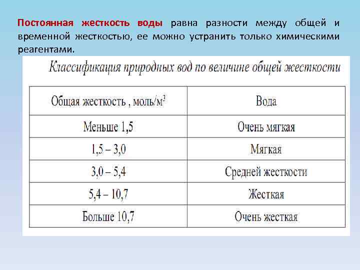Постоянная жесткость воды равна разности между общей и временной жесткостью, ее можно устранить только химическими реагентами.