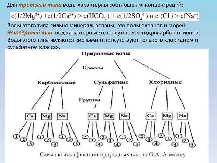 Для третьего типа воды характерны соотношения концентраций: Воды этого типа сильно минерализованы, это воды океанов и морей. Четвёртый тип вод характеризуется отсутствием гидрокарбонат-ионов. Воды этого типа являются кислыми и присутствуют только в хлоридном и сульфатном классах.