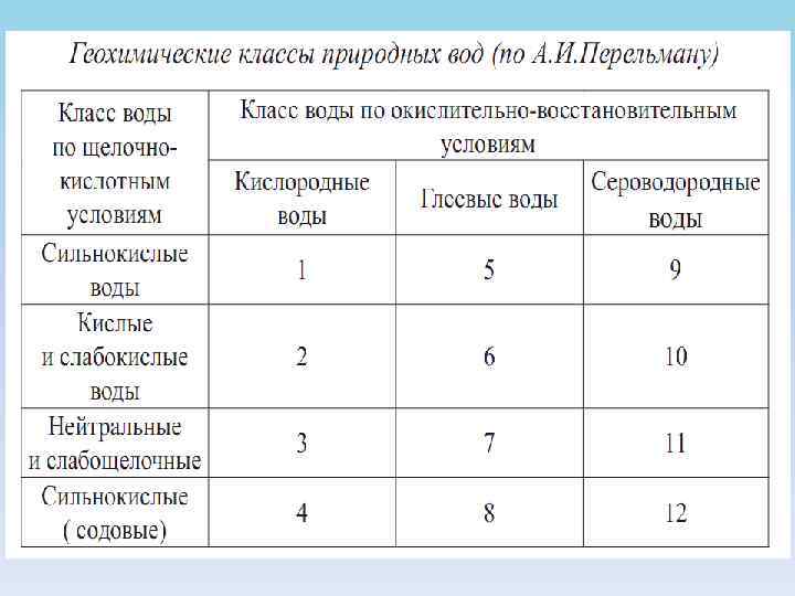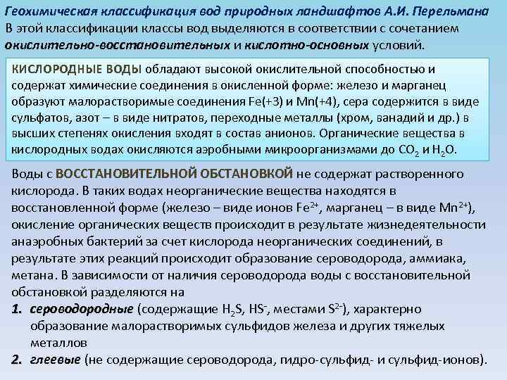 Геохимическая классификация вод природных ландшафтов А. И. Перельмана В этой классификации классы вод выделяются в соответствии с сочетанием окислительно-восстановительных и кислотно-основных условий. КИСЛОРОДНЫЕ ВОДЫ обладают высокой окислительной способностью и содержат химические соединения в окисленной форме: железо и марганец образуют малорастворимые соединения Fe(+3) и Mn(+4), сера содержится в виде сульфатов, азот – в виде нитратов, переходные металлы (хром, ванадий и др. ) в высших степенях окисления входят в состав анионов. Органические вещества в кислородных водах окисляются аэробными микроорганизмами до CO 2 и H 2 O. Воды с ВОССТАНОВИТЕЛЬНОЙ ОБСТАНОВКОЙ не содержат растворенного кислорода. В таких водах неорганические вещества находятся в восстановленной форме (железо – виде ионов Fe 2+, марганец – в виде Mn 2+), окисление органических веществ происходит в результате жизнедеятельности анаэробных бактерий за счет кислорода неорганических соединений, в результате этих реакций происходит образование сероводорода, аммиака, метана. В зависимости от наличия сероводорода воды с восстановительной обстановкой разделяются на 1. сероводородные (содержащие H 2 S, HS-, местами S 2 -), характерно образование малорастворимых сульфидов железа и других тяжелых металлов 2. глеевые (не содержащие сероводорода, гидро-сульфид- и сульфид-ионов).