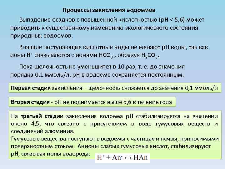 Процессы закисления водоемов Выпадение осадков с повышенной кислотностью (р. Н < 5, 6) может приводить к существенному изменению экологического состояния природных водоемов. Вначале поступающие кислотные воды не меняют р. Н воды, так как ионы Н+ связываются с ионами НСО 3 -, образуя Н 2 СО 3. Пока щелочность не уменьшится в 10 раз, т. е. до значения порядка 0, 1 ммоль/л, р. Н в водоеме сохраняется постоянным. Первая стадия закисления – щёлочность снижается до значения 0, 1 ммоль/л Вторая стадия - р. Н не поднимается выше 5, 6 в течение года На третьей стадии закисления водоема р. Н стабилизируется на значении около 4, 5, что связано с присутствием в воде гумусовых веществ и соединений алюминия. Гумусовые вещества поступают в водоемы с частицами почвы, приносимыми поверхностным стоком. Анионы слабых гумусовых кислот, стабилизируют р. Н, связывая ионы водорода:
