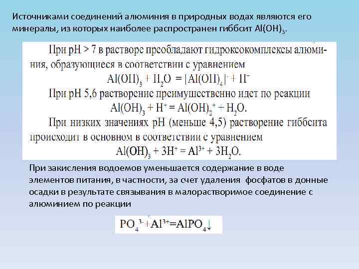 Источниками соединений алюминия в природных водах являются его минералы, из которых наиболее распространен гиббсит Al(OH)3. При закисления водоемов уменьшается содержание в воде элементов питания, в частности, за счет удаления фосфатов в донные осадки в результате связывания в малорастворимое соединение с алюминием по реакции