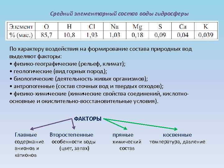 Средний элементарный состав воды гидросферы По характеру воздействия на формирование состава природных вод выделяют факторы: • физико-географические (рельеф, климат); • геологические (вид горных пород); • биологические (деятельность живых организмов); • антропогенные (состав сточных вод и твердых отходов); • физико-химические (химические свойства соединений, кислотноосновные и окислительно-восстановительные условия). ФАКТОРЫ Главные содержание анионов и катионов Второстепенные особенности воды (цвет, запах) прямые химический состав косвенные температура, давление