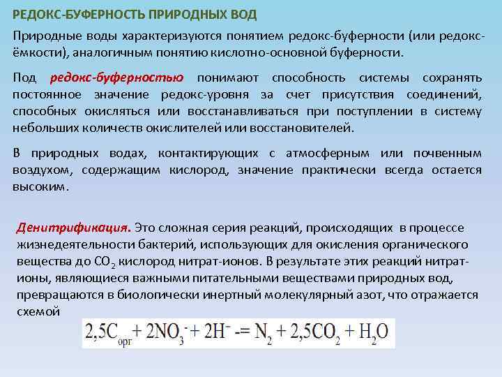 РЕДОКС-БУФЕРНОСТЬ ПРИРОДНЫХ ВОД Природные воды характеризуются понятием редокс-буферности (или редоксёмкости), аналогичным понятию кислотно-основной буферности. Под редокс-буферностью понимают способность системы сохранять постоянное значение редокс-уровня за счет присутствия соединений, способных окисляться или восстанавливаться при поступлении в систему небольших количеств окислителей или восстановителей. В природных водах, контактирующих с атмосферным или почвенным воздухом, содержащим кислород, значение практически всегда остается высоким. Денитрификация. Это сложная серия реакций, происходящих в процессе жизнедеятельности бактерий, использующих для окисления органического вещества до СО 2 кислород нитрат-ионов. В результате этих реакций нитратионы, являющиеся важными питательными веществами природных вод, превращаются в биологически инертный молекулярный азот, что отражается схемой