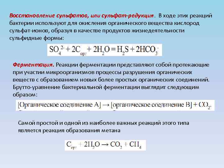 Восстановление сульфатов, или сульфат-редукция. В ходе этих реакций бактерии используют для окисления органического вещества кислород сульфат-ионов, образуя в качестве продуктов жизнедеятельности сульфидные формы: Ферментация. Реакции ферментации представляют собой протекающие при участии микроорганизмов процессы разрушения органических веществ с образованием новых более простых органических соединений. Брутто-уравнение бактериальной ферментации выглядит следующим образом: Самой простой и одной из наиболее важных реакций этого типа является реакция образования метана