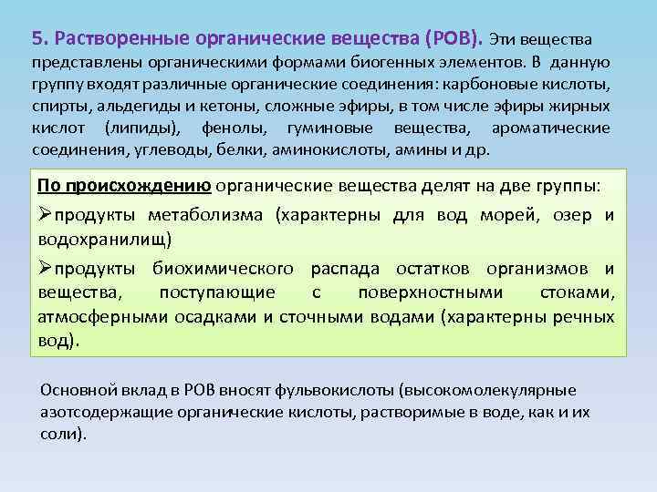 5. Растворенные органические вещества (РОВ). Эти вещества представлены органическими формами биогенных элементов. В данную группу входят различные органические соединения: карбоновые кислоты, спирты, альдегиды и кетоны, сложные эфиры, в том числе эфиры жирных кислот (липиды), фенолы, гуминовые вещества, ароматические соединения, углеводы, белки, аминокислоты, амины и др. По происхождению органические вещества делят на две группы: Øпродукты метаболизма (характерны для вод морей, озер и водохранилищ) Øпродукты биохимического распада остатков организмов и вещества, поступающие с поверхностными стоками, атмосферными осадками и сточными водами (характерны речных вод). Основной вклад в РОВ вносят фульвокислоты (высокомолекулярные азотсодержащие органические кислоты, растворимые в воде, как и их соли).