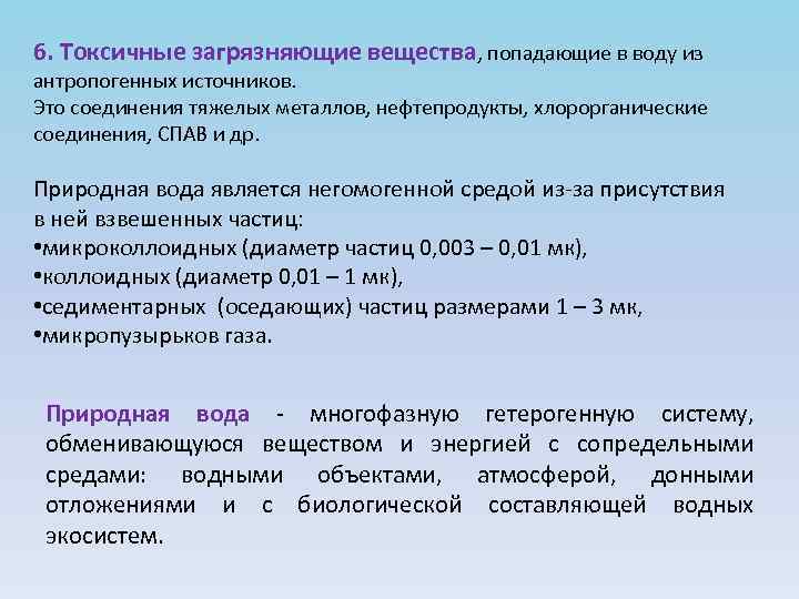 6. Токсичные загрязняющие вещества, попадающие в воду из антропогенных источников. Это соединения тяжелых металлов, нефтепродукты, хлорорганические соединения, СПАВ и др. Природная вода является негомогенной средой из-за присутствия в ней взвешенных частиц: • микроколлоидных (диаметр частиц 0, 003 – 0, 01 мк), • коллоидных (диаметр 0, 01 – 1 мк), • седиментарных (оседающих) частиц размерами 1 – 3 мк, • микропузырьков газа. Природная вода - многофазную гетерогенную систему, обменивающуюся веществом и энергией с сопредельными средами: водными объектами, атмосферой, донными отложениями и с биологической составляющей водных экосистем.