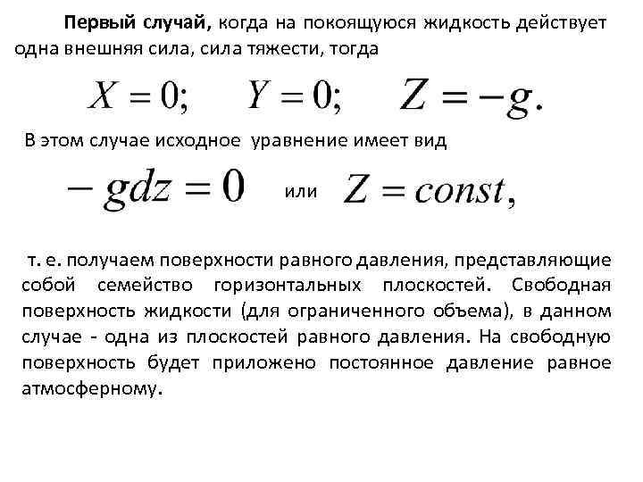 Первый случай, когда на покоящуюся жидкость действует одна внешняя сила, сила тяжести, тогда В этом случае исходное уравнение имеет вид или т. е. получаем поверхности равного давления, представляющие собой семейство горизонтальных плоскостей. Свободная поверхность жидкости (для ограниченного объема), в данном случае одна из плоскостей равного давления. На свободную поверхность будет приложено постоянное давление равное атмосферному.