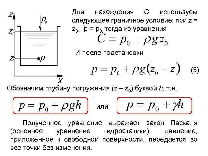 Для нахождения С используем следующее граничное условие: при z = z 0, p = p 0, тогда из уравнения И после подстановки (5) Обозначим глубину погружения (z – z 0) буквой h, т. е. или Полученное уравнение выражает закон Паскаля (основное уравнение гидростатики): давление, приложенное к свободной поверхности, передается во все точки без изменения.