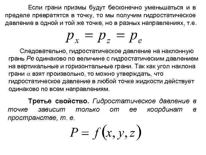 Если грани призмы будут бесконечно уменьшаться и в пределе превратятся в точку, то мы получим гидростатическое давление в одной и той же точке, но в разных направлениях, т. е. Следовательно, гидростатическое давление на наклонную грань Ре одинаково по величине с гидростатическим давлением на вертикальные и горизонтальные грани. Так как угол наклона грани взят произвольно, то можно утверждать, что гидростатическое давление в любой точке жидкости действует одинаково по всем направлениям. Третье свойство. Гидростатическое давление в точке зависит только от ее координат в пространстве, т. е.