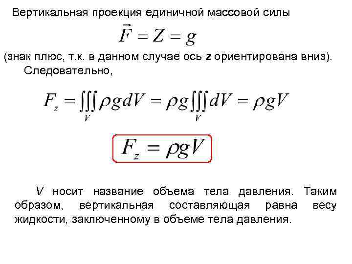 Вертикальная проекция единичной массовой силы (знак плюс, т. к. в данном случае ось z ориентирована вниз). Следовательно, V носит название объема тела давления. Таким образом, вертикальная составляющая равна весу жидкости, заключенному в объеме тела давления.
