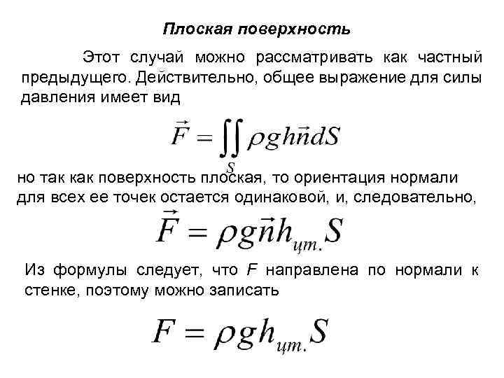 Плоская поверхность Этот случай можно рассматривать как частный предыдущего. Действительно, общее выражение для силы давления имеет вид но так как поверхность плоская, то ориентация нормали для всех ее точек остается одинаковой, и, следовательно, Из формулы следует, что F направлена по нормали к стенке, поэтому можно записать