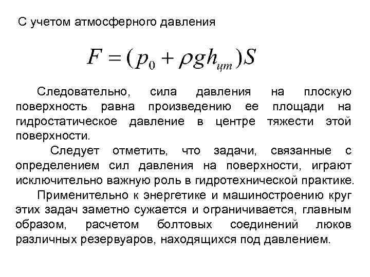 С учетом атмосферного давления Следовательно, сила давления на плоскую поверхность равна произведению ее площади на гидростатическое давление в центре тяжести этой поверхности. Следует отметить, что задачи, связанные с определением сил давления на поверхности, играют исключительно важную роль в гидротехнической практике. Применительно к энергетике и машиностроению круг этих задач заметно сужается и ограничивается, главным образом, расчетом болтовых соединений люков различных резервуаров, находящихся под давлением.