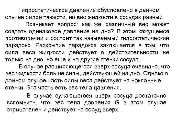 Гидростатическое давление обусловлено в данном случае силой тяжести, но вес жидкости в сосудах разный. Возникает вопрос: как же различный вес может создать одинаковое давление на дно? В этом кажущемся противоречии и состоит так называемый гидростатический парадокс. Раскрытие парадокса заключается в том, что сила веса жидкости действует в действительности не только на дно, но еще и на другие стенки сосуда. В случае расширяющегося вверх сосуда очевидно, что вес жидкости больше силы, действующей на дно. Однако в данном случае часть силы веса действует на наклонные стенки. Эта часть есть вес тела давления. В случае сужающегося вверх сосуда достаточно вспомнить, что вес тела давления G в этом случае отрицателен и действует на сосуд вверх.