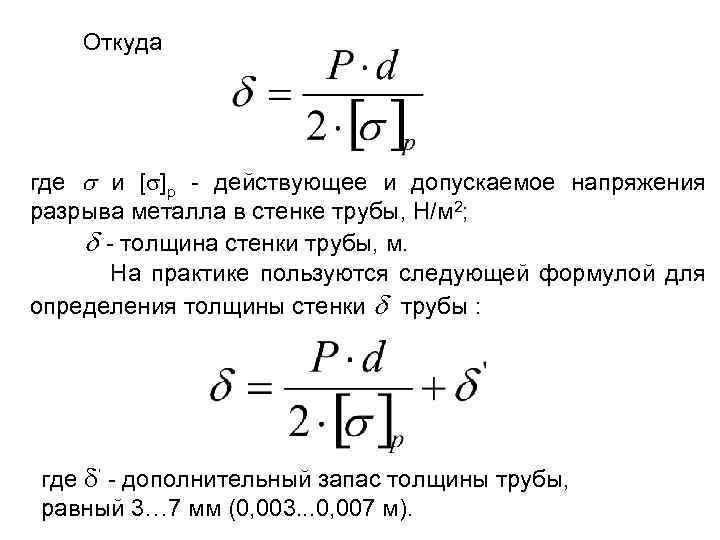Откуда где и [ ]p - действующее и допускаемое напряжения разрыва металла в стенке трубы, Н/м 2; - толщина стенки трубы, м. На практике пользуются следующей формулой для определения толщины стенки трубы : где ’ - дополнительный запас толщины трубы, равный 3… 7 мм (0, 003. . . 0, 007 м).