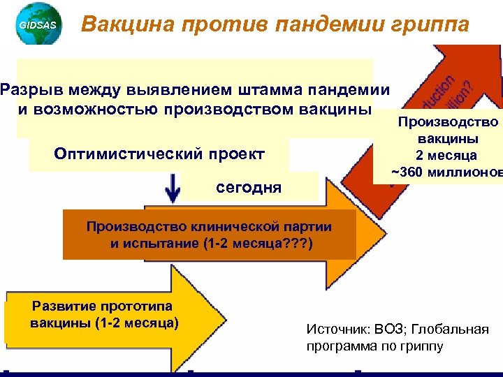 GIDSAS Вакцина против пандемии гриппа Разрыв между выявлением штамма пандемии и возможностью производством вакцины Оптимистический проект сегодня Производство вакцины 2 месяца ~360 миллионов Производство клинической партии и испытание (1 -2 месяца? ? ? ) Развитие прототипа вакцины (1 -2 месяца) Chotani, 2005 Источник: ВОЗ; Глобальная программа по гриппу