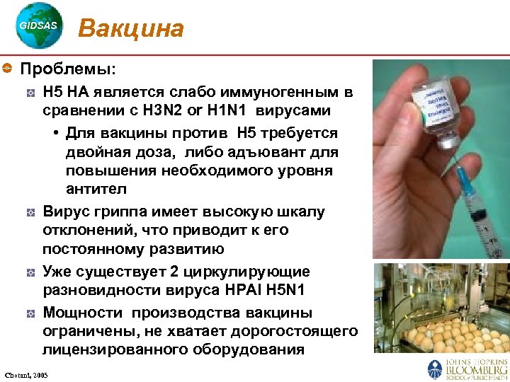 GIDSAS Вакцина Проблемы: H 5 HA является слабо иммуногенным в сравнении с H 3 N 2 or H 1 N 1 вирусами • Для вакцины против H 5 требуется двойная доза, либо адъювант для повышения необходимого уровня антител Вирус гриппа имеет высокую шкалу отклонений, что приводит к его постоянному развитию Уже существует 2 циркулирующие разновидности вируса HPAI H 5 N 1 Мощности производства вакцины ограничены, не хватает дорогостоящего лицензированного оборудования Chotani, 2005