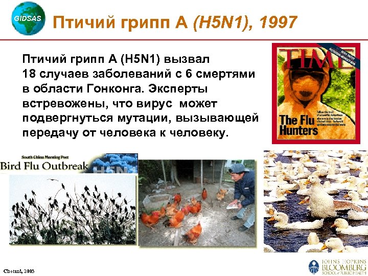 GIDSAS Птичий грипп А (H 5 N 1), 1997 Птичий грипп А (H 5 N 1) вызвал 18 случаев заболеваний с 6 смертями в области Гонконга. Эксперты встревожены, что вирус может подвергнуться мутации, вызывающей передачу от человека к человеку. Chotani, 2005