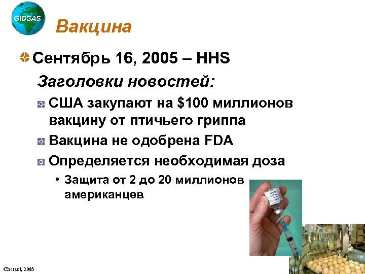 GIDSAS Вакцина Сентябрь 16, 2005 – HHS Заголовки новостей: США закупают на $100 миллионов вакцину от птичьего гриппа Вакцина не одобрена FDA Определяется необходимая доза • Защита от 2 до 20 миллионов американцев Chotani, 2005