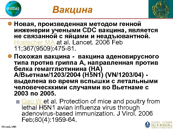 GIDSAS Вакцина Новая, произведенная методом генной инженерии учеными CDC вакцина, является не связанной с яйцами и неадъювантной. Hoelscher MA at al. Lancet. 2006 Feb 11; 367(9509): 475 -81. Похожая вакцина - вакцина аденовирусного типа против гриппа А, направленная против белка гемагглютинина (HA) A/Вьетнам/1203/2004 (H 5 N 1) (VN/1203/04) выделена во время вспышки с летальными человеческкими случаями во Вьетнаме с 2003 по 2005. Gao W et al. Protection of mice and poultry from lethal H 5 N 1 avian influenza virus through adenovirus-based immunization. J Virol. 2006 Feb; 80(4): 1959 -64. Chotani, 2005