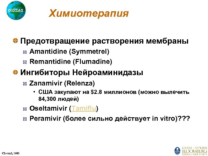GIDSAS Химиотерапия Предотвращение растворения мембраны Amantidine (Symmetrel) Remantidine (Flumadine) Ингибиторы Нейроаминидазы Zanamivir (Relenza) • США закупают на $2. 8 миллионов (можно вылечить 84, 300 людей) Oseltamivir (Tamiflu) Peramivir (более сильно действует in vitro)? ? ? Chotani, 2005
