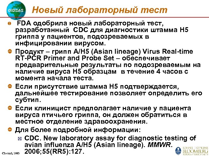 GIDSAS Новый лабораторный тест FDA одобрила новый лабораторный тест, разработанный CDC для диагностики штамма H 5 гриппа у пациентов, подозреваемых в инфицировании вирусом. Продукт – грипп A/H 5 (Asian lineage) Virus Real-time RT-PCR Primer and Probe Set – обеспечивает предварительные результаты по подозреваемым на наличие вируса Н 5 образцам в течение 4 часов с момента начала теста. Если присутствие штамма Н 5 подтверждается, дальнейшее тестирование позволяет определить его субтип. Если клиницист предполагает наличие у пациента вируса птичьего гриппа, он должен обратиться в местное отделение здравоохранения. Для более подробной информации: CDC. New laboratory assay for diagnostic testing of avian influenza A/H 5 (Asian lineage). MMWR. 2006; 55(RR 5): 127. Chotani, 2005