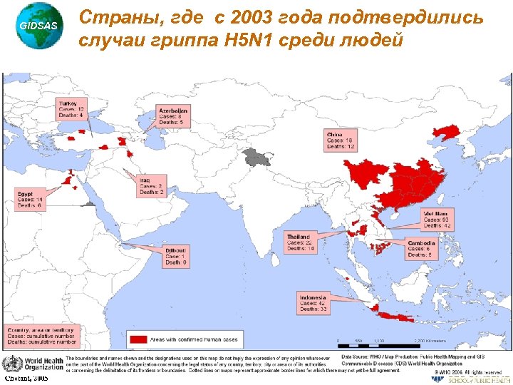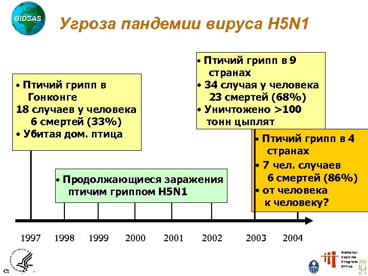 GIDSAS Угроза пандемии вируса H 5 N 1 • Птичий грипп в 9 странах • 34 случая у человека 23 смертей (68%) • Уничтожено >100 тонн цыплят • Птичий грипп в Гонконге 18 случаев у человека 6 смертей (33%) • Убитая дом. птица • Птичий грипп в 4 • Продолжающиеся заражения птичим гриппом H 5 N 1 1997 Chotani, 2005 1998 1999 2000 2001 2002 странах • 7 чел. случаев 6 смертей (86%) • от человека к человеку? 2003 2004