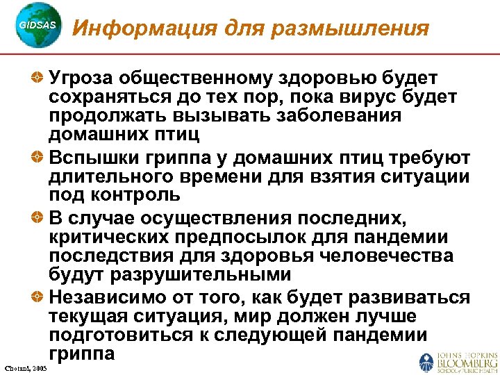 GIDSAS Информация для размышления Угроза общественному здоровью будет сохраняться до тех пор, пока вирус будет продолжать вызывать заболевания домашних птиц Вспышки гриппа у домашних птиц требуют длительного времени для взятия ситуации под контроль В случае осуществления последних, критических предпосылок для пандемии последствия для здоровья человечества будут разрушительными Независимо от того, как будет развиваться текущая ситуация, мир должен лучше подготовиться к следующей пандемии гриппа Chotani, 2005