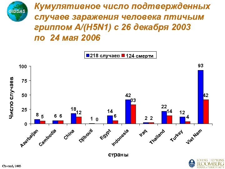 Кумулятивное число подтвержденных случаев заражения человека птичьим гриппом A/(H 5 N 1) с 26 декабря 2003 по 24 мая 2006 GIDSAS 218 случаев 124 смерти 93 Число случаев 100 75 42 33 страны Chotani, 2005 et N Vi rk ey Tu ai la nd q Ira 4 am 12 2 2 In jib ou ti D C hi na a am bo di C A ze rb ai ja n 0 6 ia 1 0 22 14 do ne s 6 6 14 yp t 8 5 18 12 Eg 25 42 Th 50