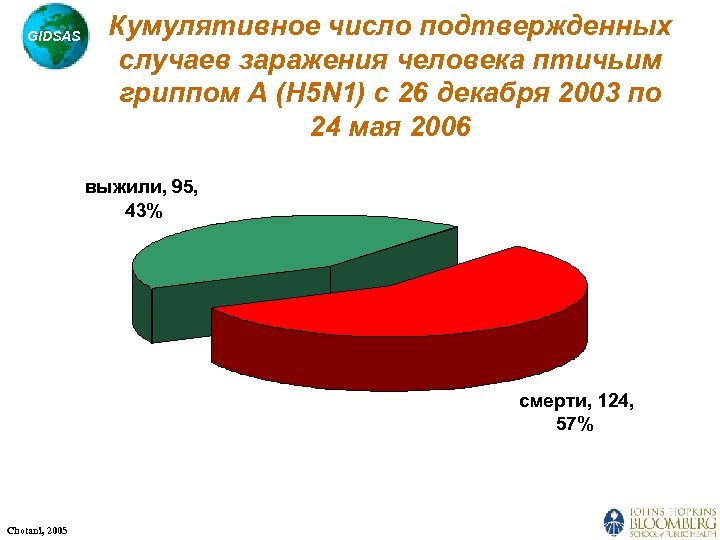 GIDSAS Кумулятивное число подтвержденных случаев заражения человека птичьим гриппом A (H 5 N 1) с 26 декабря 2003 по 24 мая 2006 выжили, 95, 43% смерти, 124, 57% Chotani, 2005