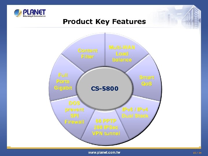 Product Key Features Content Filter Full Ports Gigabit DOS prevent SPI Firewall Multi-WAN Load balance CS-5800 60 PPTP 200 IPSec VPN tunnel Smart Qo. S IPv 6 / IPv 4 Dual Stack 10 / 34