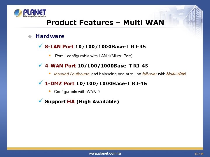 Product Features – Multi WAN u Hardware ü 8 -LAN Port 10/1000 Base-T RJ-45 • Port 1 configurable with LAN 1(Mirror Port) ü 4 -WAN Port 10/1000 Base-T RJ-45 • Inbound / outbound load balancing and auto line fail-over with Multi-WAN ü 1 -DMZ Port 10/1000 Base-T RJ-45 • Configurable with WAN 5 ü Support HA (High Available) 11 / 34