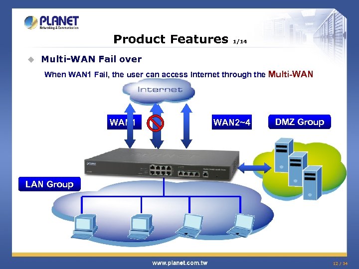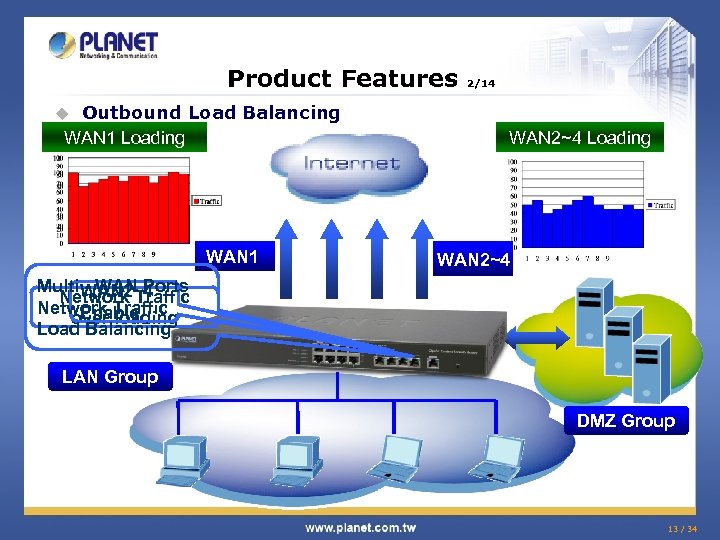 Product Features u 1/14 Multi-WAN Fail over When WAN 1 Fail, the user can access Internet through the Multi-WAN 1 WAN 2~4 DMZ Group LAN Group 12 / 34