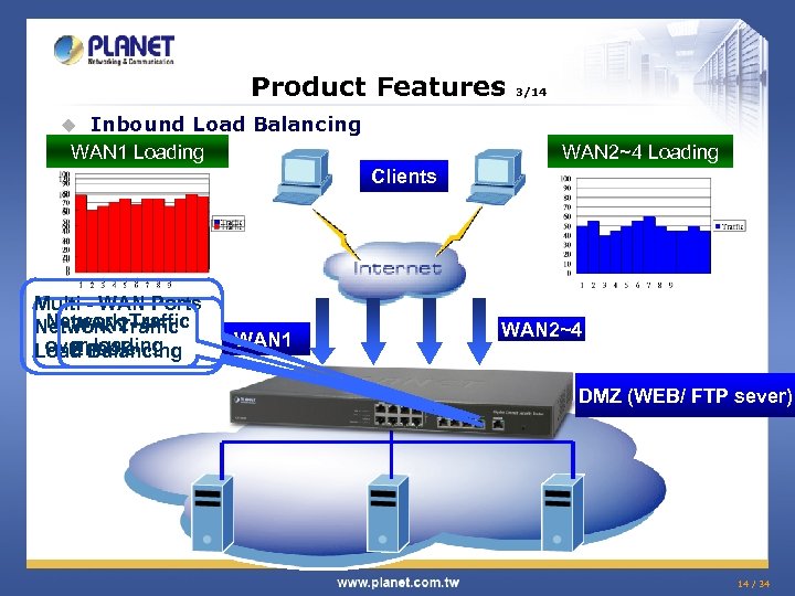 Product Features Inbound Load Balancing WAN 1 Loading 3/14 u WAN 2~4 Loading Clients Multi - WAN Ports Network Traffic WAN 2~4 Network Traffic over loading Enable Load Balancing WAN 1 WAN 2~4 DMZ (WEB/ FTP sever) 14 / 34