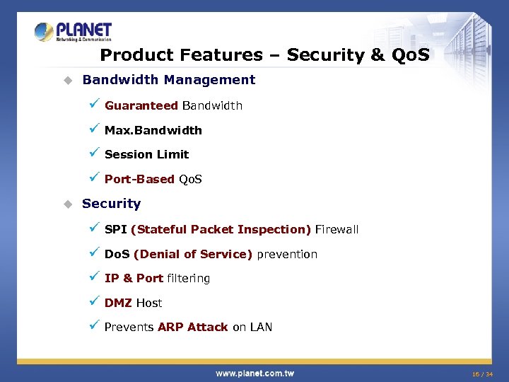 Product Features – Security & Qo. S u Bandwidth Management ü Guaranteed Bandwidth ü Max. Bandwidth ü Session Limit ü Port-Based Qo. S u Security ü SPI (Stateful Packet Inspection) Firewall ü Do. S (Denial of Service) prevention ü IP & Port filtering ü DMZ Host ü Prevents ARP Attack on LAN 16 / 34