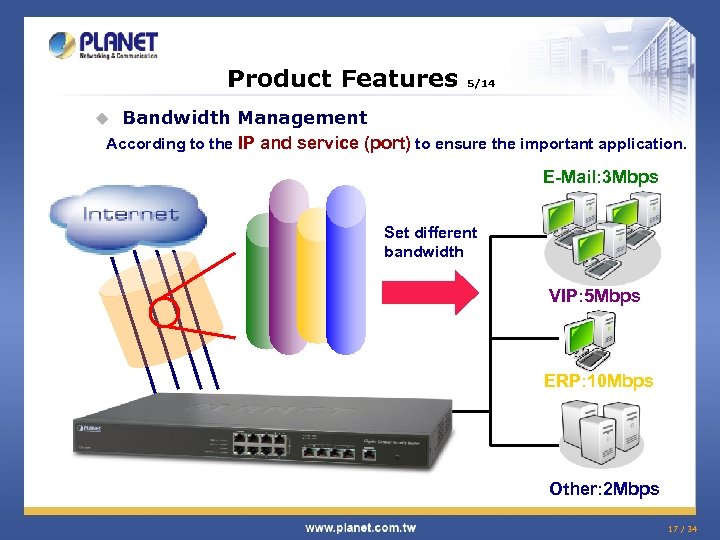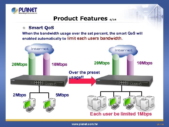 Product Features 5/14 Bandwidth Management According to the IP and service (port) to ensure the important application. u E-Mail: 3 Mbps Set different bandwidth VIP: 5 Mbps ERP: 10 Mbps Other: 2 Mbps 17 / 34
