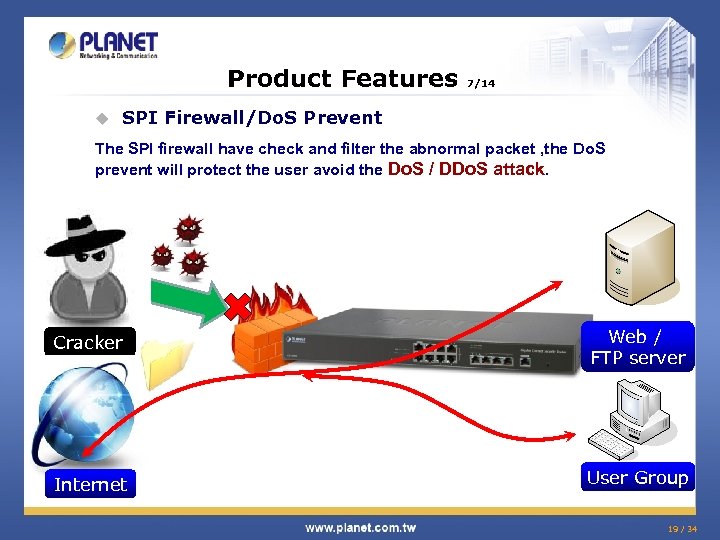 Product Features u 7/14 SPI Firewall/Do. S Prevent The SPI firewall have check and filter the abnormal packet , the Do. S prevent will protect the user avoid the Do. S / DDo. S attack. Cracker Web / FTP server Internet User Group 19 / 34