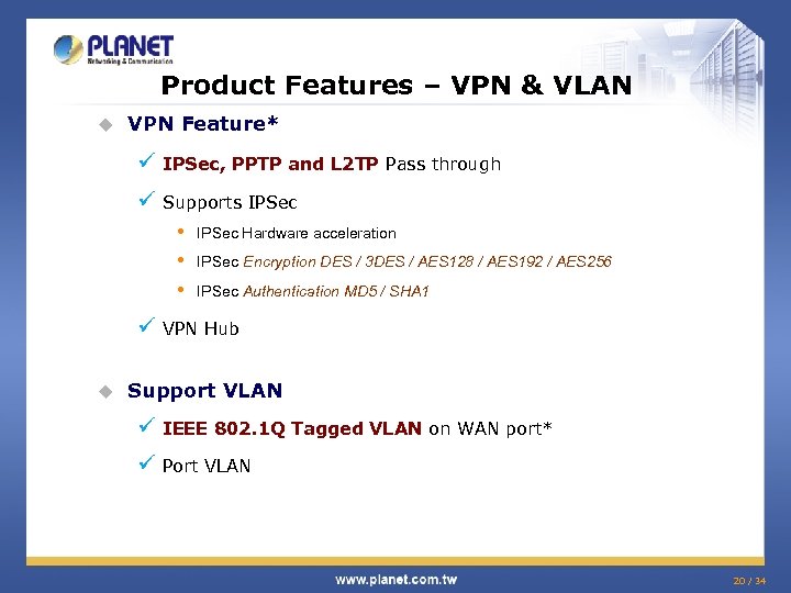 Product Features – VPN & VLAN u VPN Feature* ü IPSec, PPTP and L 2 TP Pass through ü Supports IPSec • • • IPSec Hardware acceleration IPSec Encryption DES / 3 DES / AES 128 / AES 192 / AES 256 IPSec Authentication MD 5 / SHA 1 ü VPN Hub u Support VLAN ü IEEE 802. 1 Q Tagged VLAN on WAN port* ü Port VLAN 20 / 34