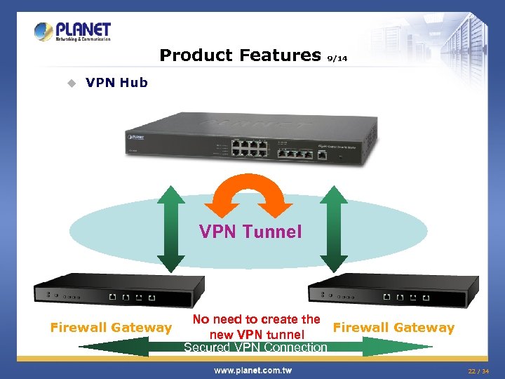 Product Feature u 8/14 IPSec VPN (Site to Site) Headquarter Cause the data via the VPN tunnel will be encrypt, so even the hacker intercept this data still can’t read this information. VP N Tu nn Hacker el Branch Office !@#$%^&*())_ ? ? ? ? ? 21 / 34