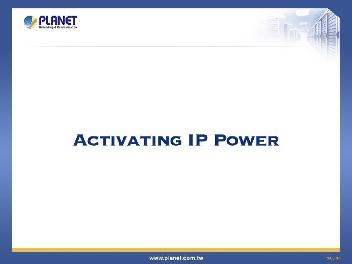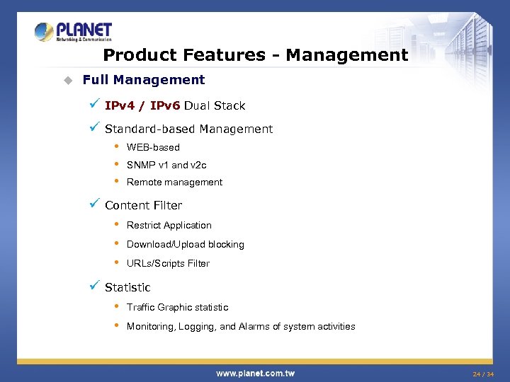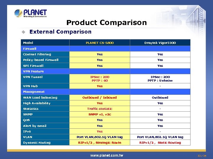 Product Comparison u External Comparison Model PLANET CS-5800 Draytek Vigor 3300 Content Filtering Yes Policy-based Firewall Yes SPI Firewall Yes VPN Feature VPN Tunnel IPSec : 200 PPTP : 60 IPSec : 200 PPTP : Unknow Yes - Outbound / Inbound Outbound Yes Traffic statistic - SNMP v 1, v 2 c Yes Qo. S Yes Alert by email Yes IPv 6 Yes - VLAN Port VLAN, 802. 1 Q VLAN tag RIPv 1/2 , Strategic Route RIPv 1/2 , Static Routing Firewall VPN Hub Management WAN Load balancing High Availability Statistics SNMP Dynamic routing 33 / 34