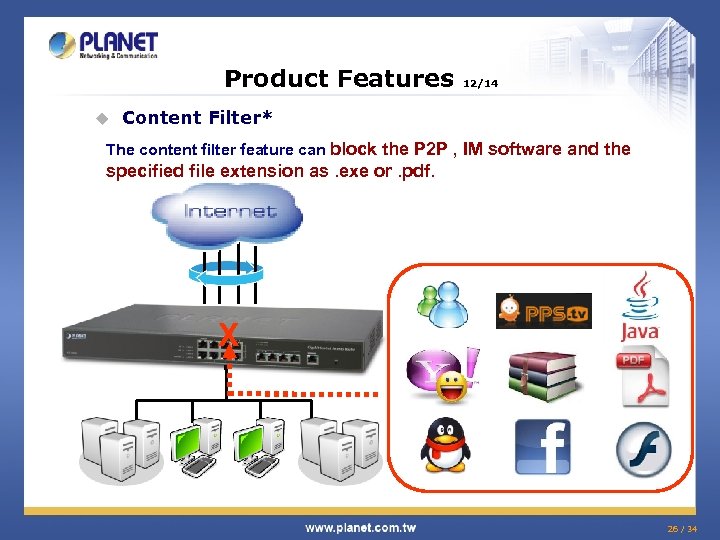 Product Features u 12/14 Content Filter* The content filter feature can block the P 2 P , IM software and the specified file extension as. exe or. pdf. X 26 / 34