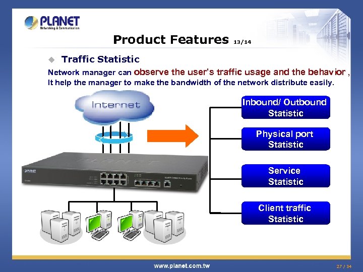 Product Features 13/14 Traffic Statistic Network manager can observe the user’s traffic usage and the behavior , u It help the manager to make the bandwidth of the network distribute easily. Inbound/ Outbound Statistic Physical port Statistic Service Statistic Client traffic Statistic 27 / 34