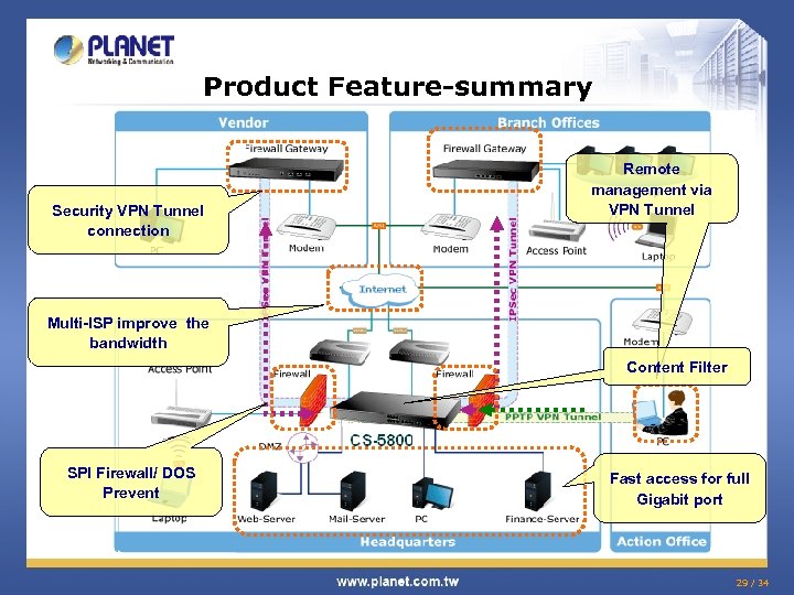 Product Feature-summary Security VPN Tunnel connection Remote management via VPN Tunnel Multi-ISP improve the bandwidth Content Filter SPI Firewall/ DOS Prevent Fast access for full Gigabit port 29 / 34