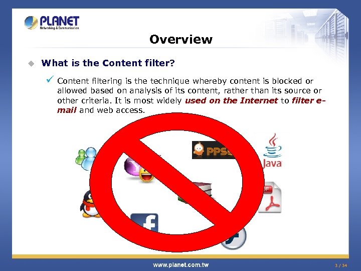 Overview u What is the Content filter? ü Content filtering is the technique whereby content is blocked or allowed based on analysis of its content, rather than its source or other criteria. It is most widely used on the Internet to filter email and web access. 3 / 34