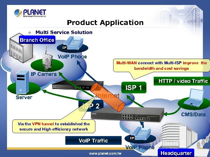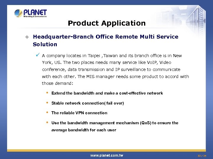 Product Application u Headquarter-Branch Office Remote Multi Service Solution ü A company locates in Taipei , Taiwan and its branch office is in New York, US. The two places needs many service like Vo. IP, Video conference, data transmission and IP surveillance to communicate with each other. The MIS manager needs some product to accord with those demand: • Extend the bandwidth and make a cost-effective network • Stable network connection( fail over) • The reliable VPN connection • Use the bandwidth management mechanism (Qo. S) to ensure the average bandwidth for each user 30 / 34