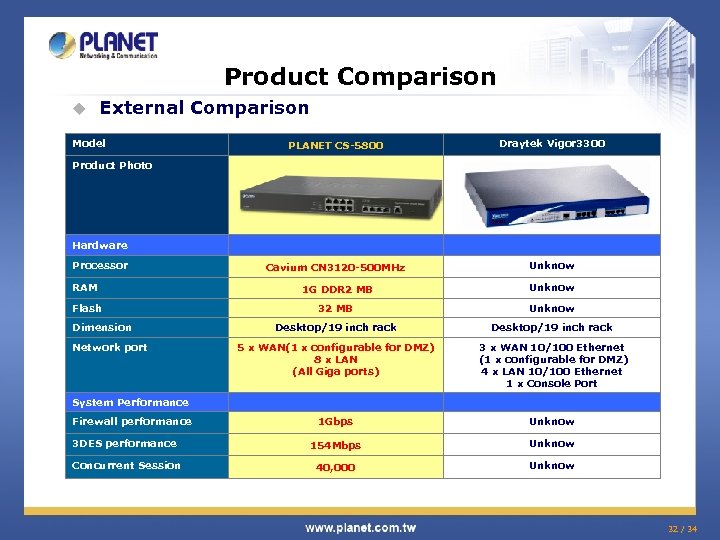 Product Comparison u External Comparison Model PLANET CS-5800 Draytek Vigor 3300 Hardware Processor Cavium CN 3120 -500 MHz Unknow RAM 1 G DDR 2 MB Unknow Flash 32 MB Unknow Desktop/19 inch rack 5 x WAN(1 x configurable for DMZ) 8 x LAN (All Giga ports) 3 x WAN 10/100 Ethernet (1 x configurable for DMZ) 4 x LAN 10/100 Ethernet 1 x Console Port System Performance Firewall performance 1 Gbps Unknow 3 DES performance 154 Mbps Unknow Concurrent Session 40, 000 Unknow Product Photo Dimension Network port 32 / 34