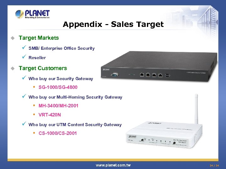 Appendix - Sales Target u Target Markets ü ü u SMB/ Enterprise Office Security Reseller Target Customers ü Who buy our Security Gateway • ü Who buy our Multi-Homing Security Gateway • • ü SG-1000/SG-4800 MH-3400/MH-2001 VRT-420 N Who buy our UTM Content Security Gateway • CS-1000/CS-2001 34 / 34