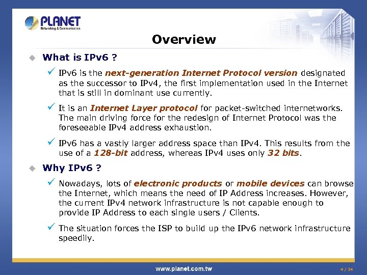 Overview u What is IPv 6 ? ü IPv 6 is the next-generation Internet Protocol version designated as the successor to IPv 4, the first implementation used in the Internet that is still in dominant use currently. ü It is an Internet Layer protocol for packet-switched internetworks. The main driving force for the redesign of Internet Protocol was the foreseeable IPv 4 address exhaustion. ü IPv 6 has a vastly larger address space than IPv 4. This results from the use of a 128 -bit address, whereas IPv 4 uses only 32 bits. u Why IPv 6 ? ü Nowadays, lots of electronic products or mobile devices can browse the Internet, which means the need of IP Address increases. However, the current IPv 4 network infrastructure is not capable enough to provide IP Address to each single users / Clients. ü The situation forces the ISP to build up the IPv 6 network infrastructure speedily. 4 / 34