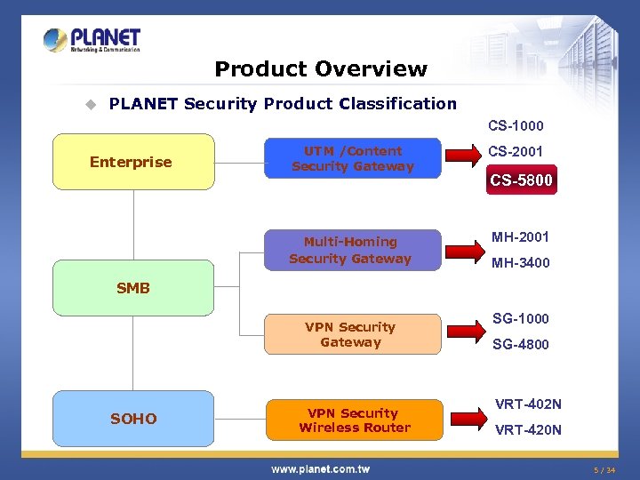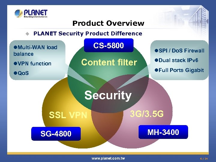 Product Overview u PLANET Security Product Classification CS-1000 Enterprise UTM /Content Security Gateway Multi-Homing Security Gateway CS-2001 CS-5800 MH-2001 MH-3400 SMB VPN Security Gateway SOHO VPN Security Wireless Router SG-1000 SG-4800 VRT-402 N VRT-420 N 5 / 34